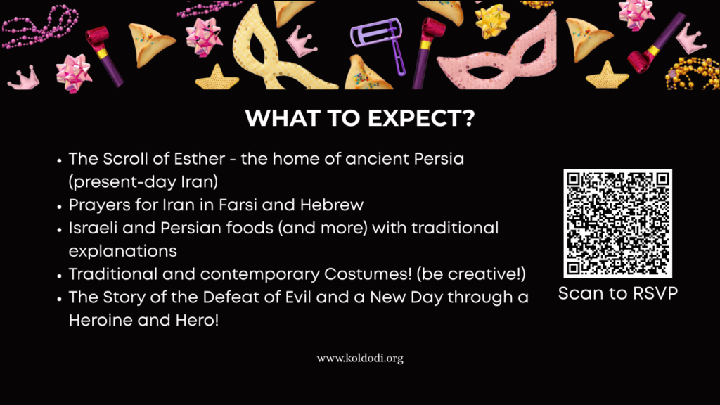 As we approach our famous Jewish holiday of Purim, this year we want to not stay ignorant to the history unfolding in front of our eyes, and how God moves through it. Celebrate freedom and hope of a better future at Purim 2026: “A Free Iran!” Join us at Kol Dodi on Saturday, February 28th at 11:00 AM. Don’t miss out on this inspiring event! Register NOW – Spots are filling out fast!